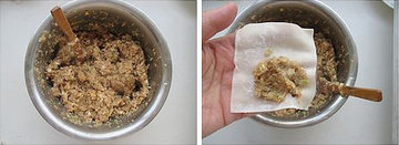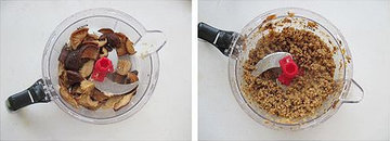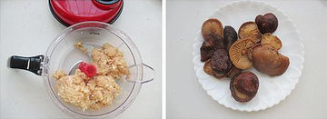 9、在肉馅中加入香菇末,一匙芝麻油,一大匙花生油,二大匙酱油,适量盐拌匀。
