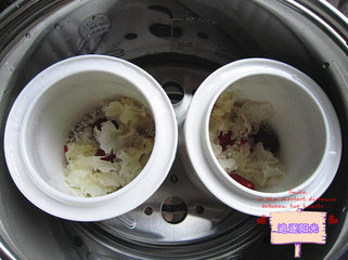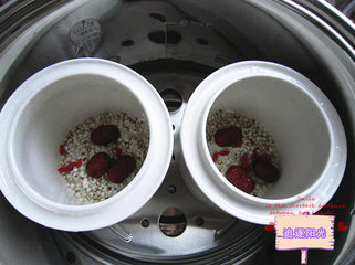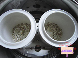 3、将俩小盅放入容器内不锈钢垫板上,糯米,薏米仁洗净分放入俩小盅。