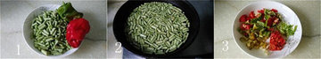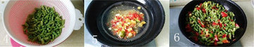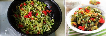 6、放入豇豆、辣椒翻炒均匀,炒至辣椒断生。