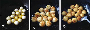 7、等油温稍微降下来,红糖沉入油底,依次放入圆子,开小火慢炸,这时不要去动它,可以经常晃动锅子。
