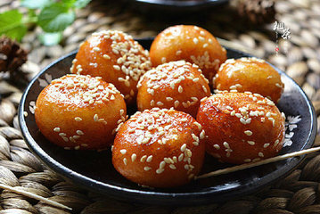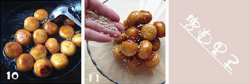 2、炸好的果子要趁热撒芝麻,否则温度降低后就很难粘上芝麻了 。