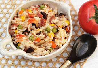 主料:大米(适量),番茄(一整个),香菇,腊肠(50g),胡萝卜、玉米、豌豆
