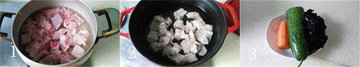 主料:排骨500克,胡萝卜半根,老黄瓜半根,泡发黑木耳适量,生姜3-4片,香葱碎适量