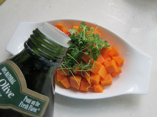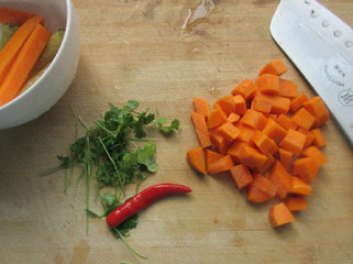 6、香菜和胡萝卜切丁。