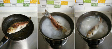 2、另起锅,加油将鲫鱼下锅煎至双面酥黄,再将煎好的鱼转至薏米汤锅里,先大火煮开,再转小火炖煮至食材出味,汤底鲜美。