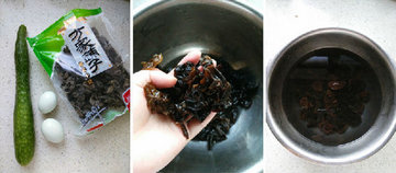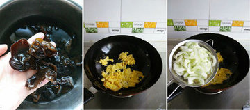 2、这是泡发好的木耳,将泡好的木耳控水备用,热锅加油将鸡蛋打散加入,炒至凝固后再将黄瓜去皮改刀下锅同炒。