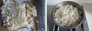 2、金针菇多切去点底端的根口感会更嫩些, 提前焯煮熟过凉。
