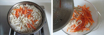 3、配菜可以生吃的就无须焯水,红萝卜丝放入有点油的水中焯一下能让它吸收的油分,有利于胡萝卜素的吸收。