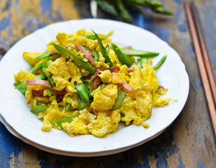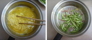 这道芦笋炒鸡蛋的做法非常简单,而且营养也特别丰富。做这道菜时,把芦笋直接分两部分,根部去皮做炒菜,稍部白灼或者做浓汤或者煎烤。一物多用,一点儿也不浪费。当然,用稍部较嫩的那些来炒蛋也是很美的了。一道清新小菜,美美哒。