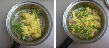 3、炒锅倒油烧热,下鸡蛋。炒散出锅。