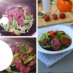 2、腊肠切成薄片,热锅,下适量油,倒入蒜蓉爆香,加上辣椒丝翻炒均匀,倒进腊肠片继续翻炒片刻。