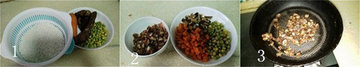 主料:大米300克,川味腊肠1小根,豌豆适量,胡萝卜拌根,泡发香菇几朵,香葱碎适量