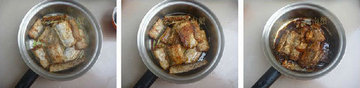 7、放上煎好的鱼,倒上水性调料醒加盐和糖。锅具不同,这里所需要的液体也不一样,我这里只用加些生抽老就可以了,其它锅具可能需要水,酌量添加。