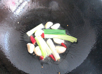 4、锅里放油,放葱,姜,大蒜,红辣椒爆香。