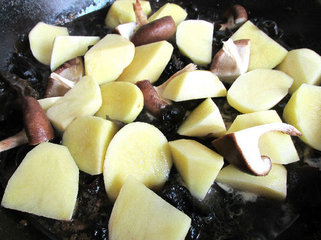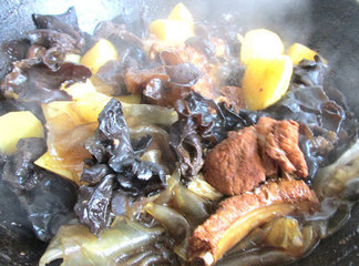8、烧开后改小火炖约40分钟,加入黑木耳,土豆,香菇炖约15分钟。