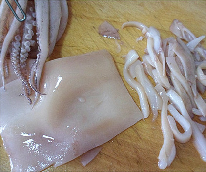 1、鱿鱼切丝备用。