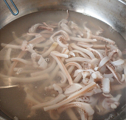 2、将鱿鱼丝焯水。