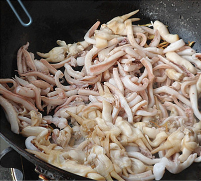 7、炝出香味,放入鱿鱼和蛏子。