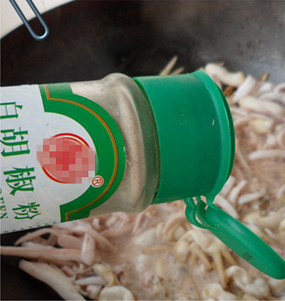 8、烹入料酒,放入白胡椒粉,盐。快速翻炒。