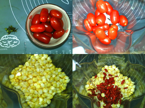 1、圣女果洗净去蒂,放入料理机。加入玉米粒,枸杞,100克水。