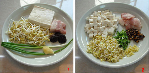 主料:豆腐2块,豆芽150克,香菇2朵,五花肉一小块,生姜一小块,香葱一根