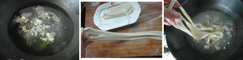 3、煮面:锅内用的羊肉汤,烧开后取一片面片,抻长至半米左右,然后从中间有擀面杖印痕的地方裂开,再抻长抻薄,下入锅中煮熟,出锅稍加一点辣椒酱即可。