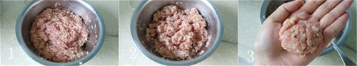 1、肉馅加入清水搅打上劲至起胶,肉馅口感不干,加入色拉油口感更滑嫩。