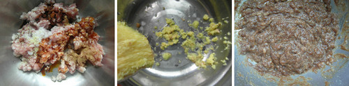 2、调制馅料:猪肉馅500克,盐5克、白糖5克、鸡精2克、十三香3克、老抽10克、香油适量,以上材料放在一起。12克姜,擦成茸,加300克水(有高汤最好,可以加到450克。),混合成姜汁。把姜汁分次加入肉馅,搅拌均匀。