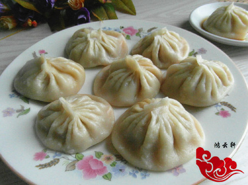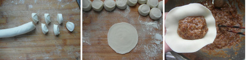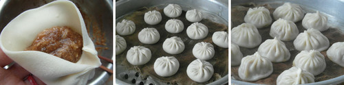 3、包和蒸:醒好的面团搓成长条,象包饺子一样切成小面剂。比平常包饺子的皮儿大一些,也是中间厚边缘薄。加入适量的肉馅。