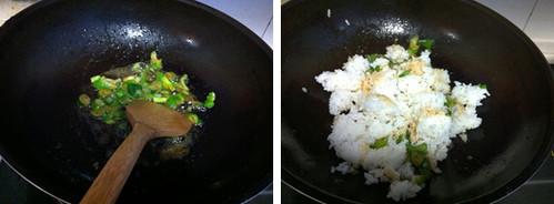 1、葱花炝锅炒出香味,倒入米饭翻炒。