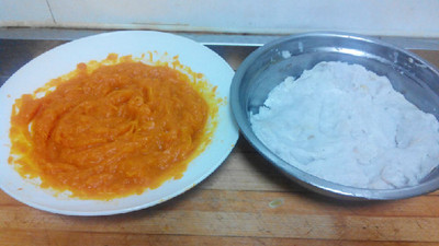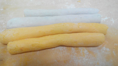4、把木薯淀粉和白糖分别加入到芋头泥和南瓜泥中,揉成不粘手的面团,并搓成长条。