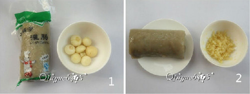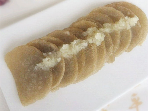 3、灌肠切薄片;蒜泥加盐用凉开水调匀,滴一点儿香油。