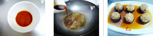 11、蒸香菇肉丸的汤汁倒进锅里烧开,加入蚝油水淀粉汁搅拌均匀。