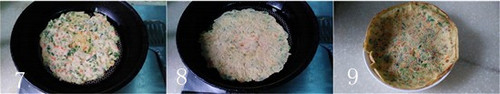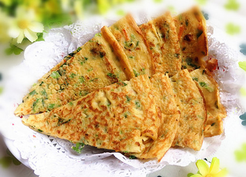 8、面糊凝固,煎至一面金黄。翻面,煎至蛋饼两面金黄,熟透即成。
