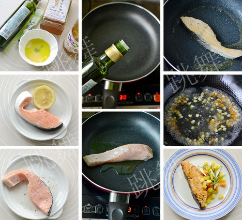 3、锅内入橄榄油,将三文鱼放入煎8分左右熟。(各边都煎过)。