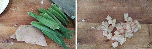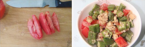 主料:秋葵200克,鸡胸肉150克,西红柿1个