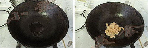 2、将鸡肉切成丁加盐、胡椒、料酒腌制10分钟。