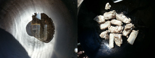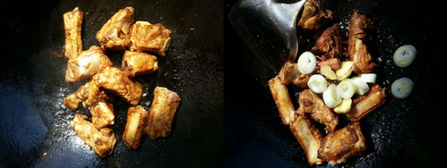6、将排骨下入,翻炒。