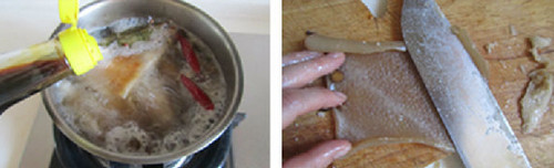 4、煮好后肉皮拿出来将背面的油脂再去除干净。