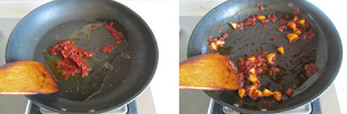 7、烧热锅, 放少许油, 下入剁碎的豆瓣酱煸炒。