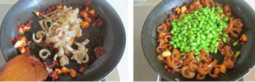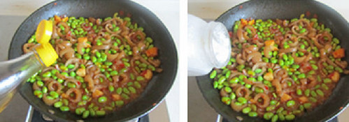 2、烧热锅,爆香剁碎的豆瓣酱翻炒,翻炒出红油后加入准备好的肉皮丝,再加入毛豆米一起翻炒,最后加入料酒和盐等调味料翻炒均匀即可。