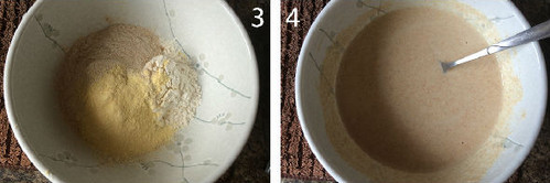 3、另取一个大碗,将煎饼的材料放入大碗里,加入清水。我剩了一汤匙左右的玉米面,也加进去了。