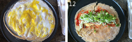 11、将蛋戳破,时均匀覆盖在饼上,蛋基本凝固时翻面。