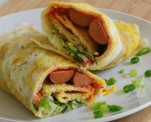 配料:辣酱适量,甜面酱适量,黄瓜半根,葱2根,香肠4根,鸡蛋4个