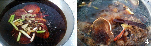3、锅里加入适量水,加入牛舌、八角、桂皮、香叶、生姜、大蒜、葱、泡椒、花椒,大火煮开后改中火煮半小时。