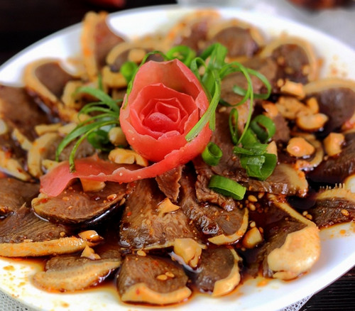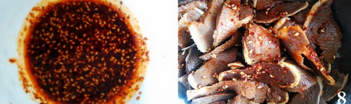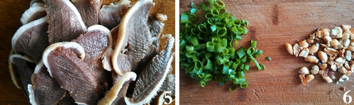 8、将调料汁倒入牛舌片里拌匀,撒上花生碎、葱花即可。