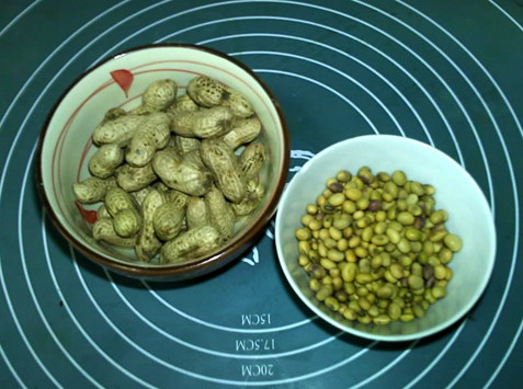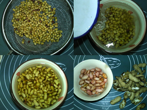 2、黄豆洗净,加水浸泡至涨发。花生去壳,取用50克。