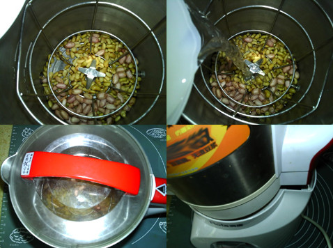 3、将黄豆花生倒入豆腐机,加入清水,盖上盖子,放入机座,卡好。