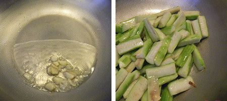 5、炒锅内倒入食用油,放入姜蒜片炒香。