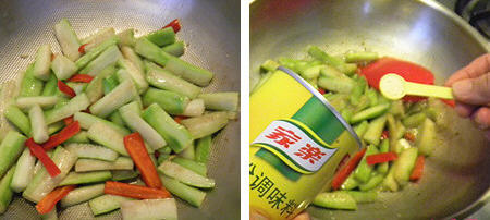 6、放入腌好的丝瓜(丝瓜在腌制时会产生汤汁,要控干水份)翻炒。